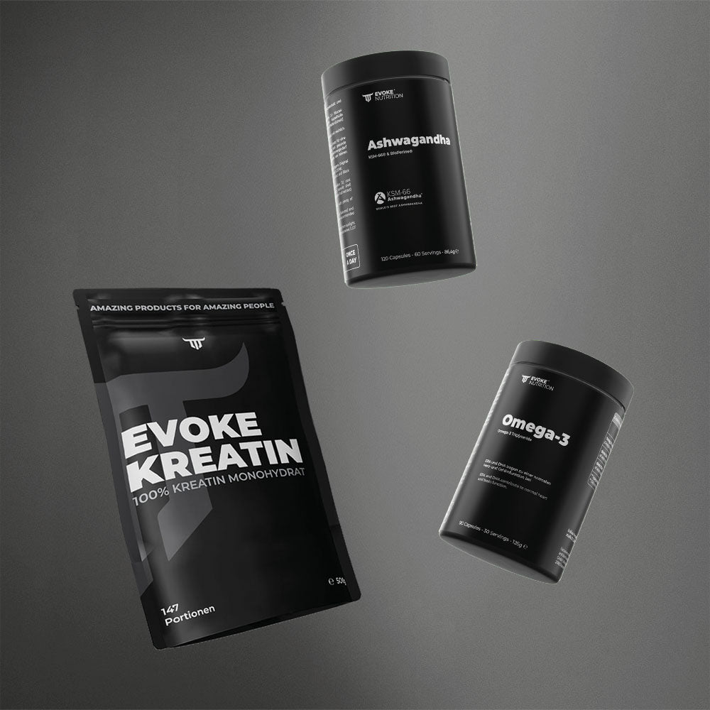 Wir empfehlen 3 - 5g Kreatin oder 1g pro 10kg Körpergewicht.Wir empfehlen eine tägliche Einnahme von 3 Kapseln Omega 3 und 2 Kapseln Ashwagandha.